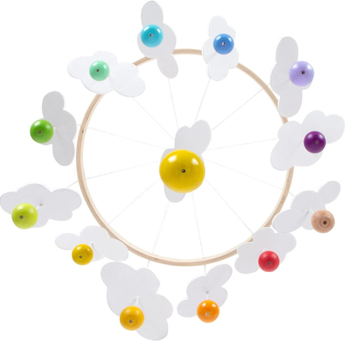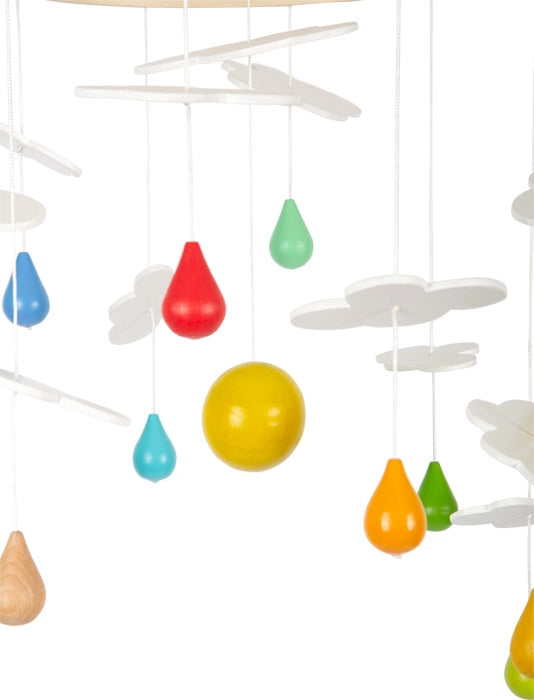 Gocce di pioggia nei colori dell'arcobaleno! Attaccato sopra il lettino o il fasciatoio, questa moderna giostrina in legno suscita la curiosità dei piccoli osservatori, perché dalla loro prospettiva gli elementi mobili tridimensionali sono particolarmente visibili! I colori naturali dell'arcobaleno completano armoniosamente il bianco sobrio e gli elementi in legno naturale. Sogni celestiali garantiti! La giostrina può essere attaccata facilmente e in modo sicuro sopra il lettino o il fasciatoio e si integra bene in cameretta grazie al design calmo e ai colori perfettamente mescolati. Le gocce di pioggia sono smaltate in modo che la venatura del legno rimanga riconoscibile! I bordi arrotondati e le forme morbide forniscono un aspetto e una sensazione piacevole. La forma rotonda degli elementi favorisce anche il movimento rotatorio della giostrina e aumenta l'effetto calmante!